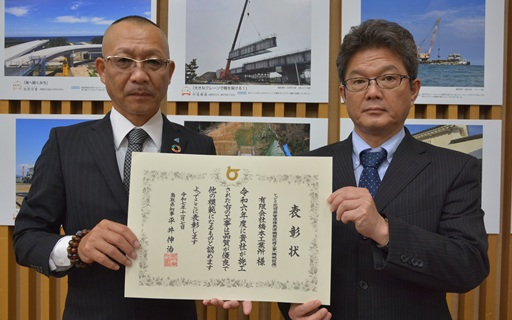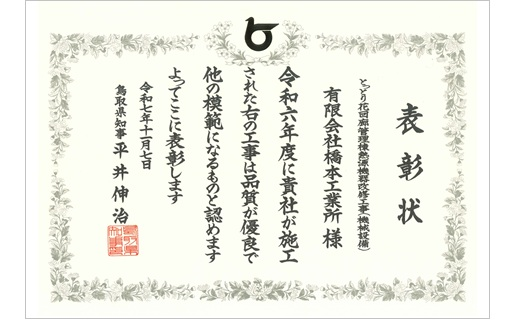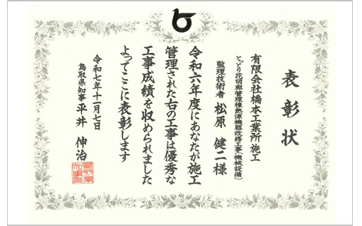 鳥取県発注工事で優良工事施工者・優良技術者に表彰されました。